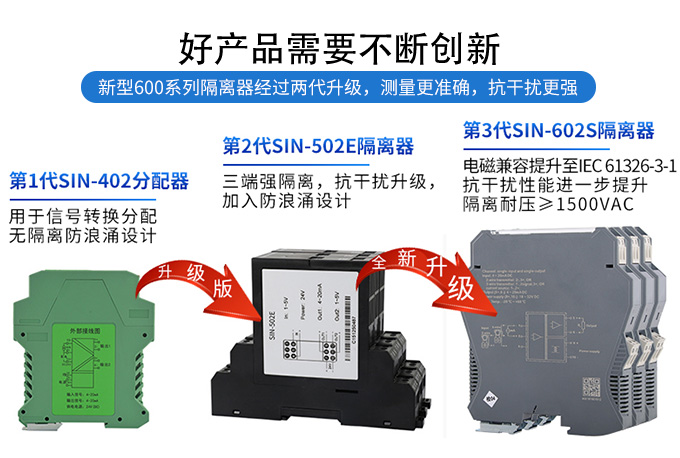 新款隔離器可向變送器提供隔離的工作電源,同時(shí)檢測(cè)回路中的電流,經(jīng)隔離變送輸出電流或電壓信號(hào)。 輸入端、輸出端及電源端三端隔離,具有響應(yīng)快、功耗低、溫度特性好等優(yōu)點(diǎn)。