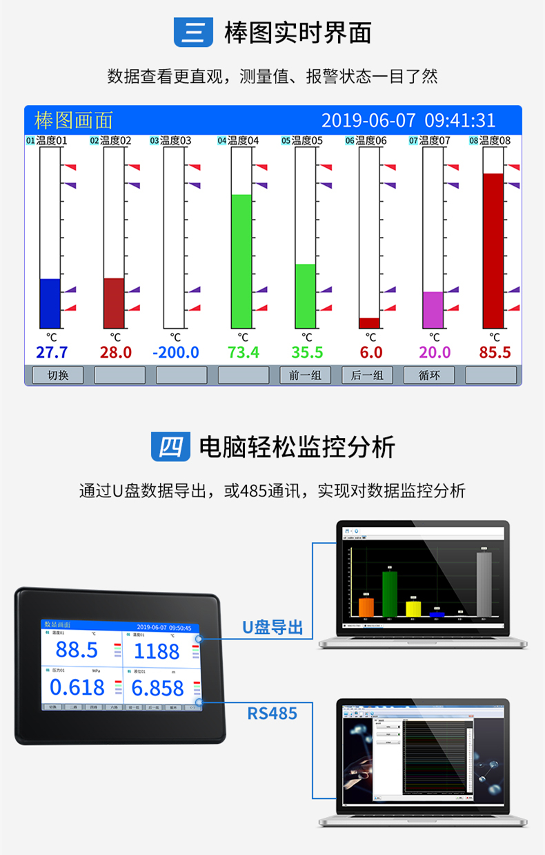 SIN-R5700C觸摸超薄無紙記錄儀采用新型大規模集成電路,對輸入、輸出、電源、信號采取可靠保護和強抗干擾設計。8路萬能信號輸入(可組態選擇輸入:標準電壓、標準電流、熱電偶、熱電阻、毫伏等)。可帶4路報警輸出,1個饋電輸出,RS485通訊接口,以太網接口,微型打印機接口和USB接口,SD卡插座;具有強大的顯示功能,實時曲線顯示,歷史曲線追憶,棒圖顯示,報警狀態顯示。