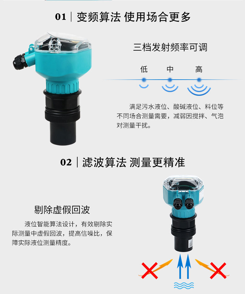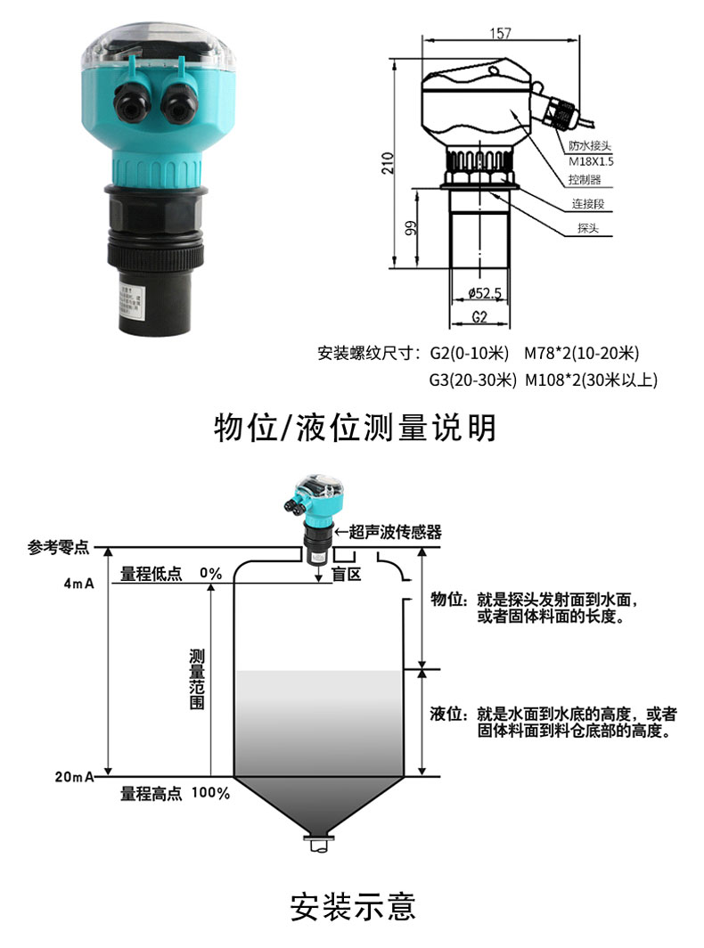 在測量中超聲波脈沖由傳感器(換能器)發出,聲波經液體表面反射后被同一傳感器接收或超聲波接收器,通過壓電晶體或磁致伸縮器件轉換成電信號,并由聲波的發射和接收之間的時間來計算傳感器到被測液體表面的距離。 由于采用非接觸的測量,被測介質幾乎不受限制,可廣泛用于各種液體和固體物料高度的測量。